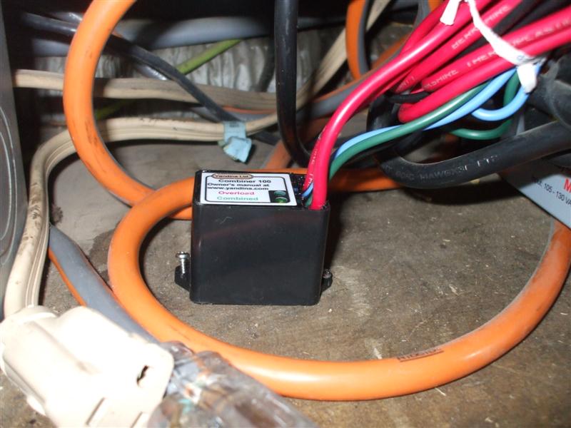 Below, inside the coach's electrical room I added a combiner. When the large battery was in the Onan compartment I did not worry about drawing some current from it. It was tied to the house batteries so it would charge. Our Onan charger is unhooked and uses the on board converter for that. Well, this combiner will allow the lawnmower battery to be connected any time there is a charge coming in. Does not matter if it is from the on board converter or the solar. When no charge is coming in, the combiner relay flips and they are no longer connected. We have one of these between our house batteries and the engine battery also. I like this setup.